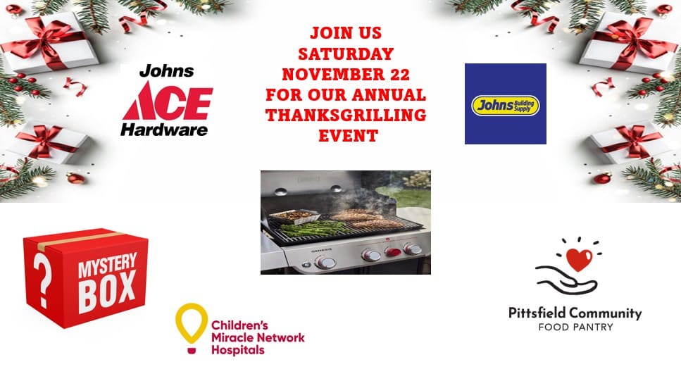 Join us Saturday November 22nd for our Annual Thanksgrilling Event. We will have grilling demos from 11AM-2PM with lots of ideas for you. And it is our First Mystery Box Sale also. Buy a mystery box and who knows what great deals you will find inside. A portion of the proceeds for our Mystery Boxes will be going to the Children's Miracle Network. We will also be heading up a Food Drive to benefit the Pittsfield Community Food Pantry. Looking forward to seeing you here.