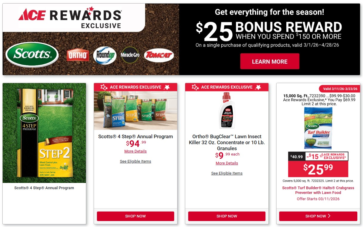 Check out our current flyer Check out our current flyer ffor great deals on a wide variety of top brand products from John's Ace Hardware.With spring just right around the corner it is never too early to start thinking about your game plan for a beautiful lawn this summer. We offer the full lineup of Scotts products and the expert advice to help you green up this spring.